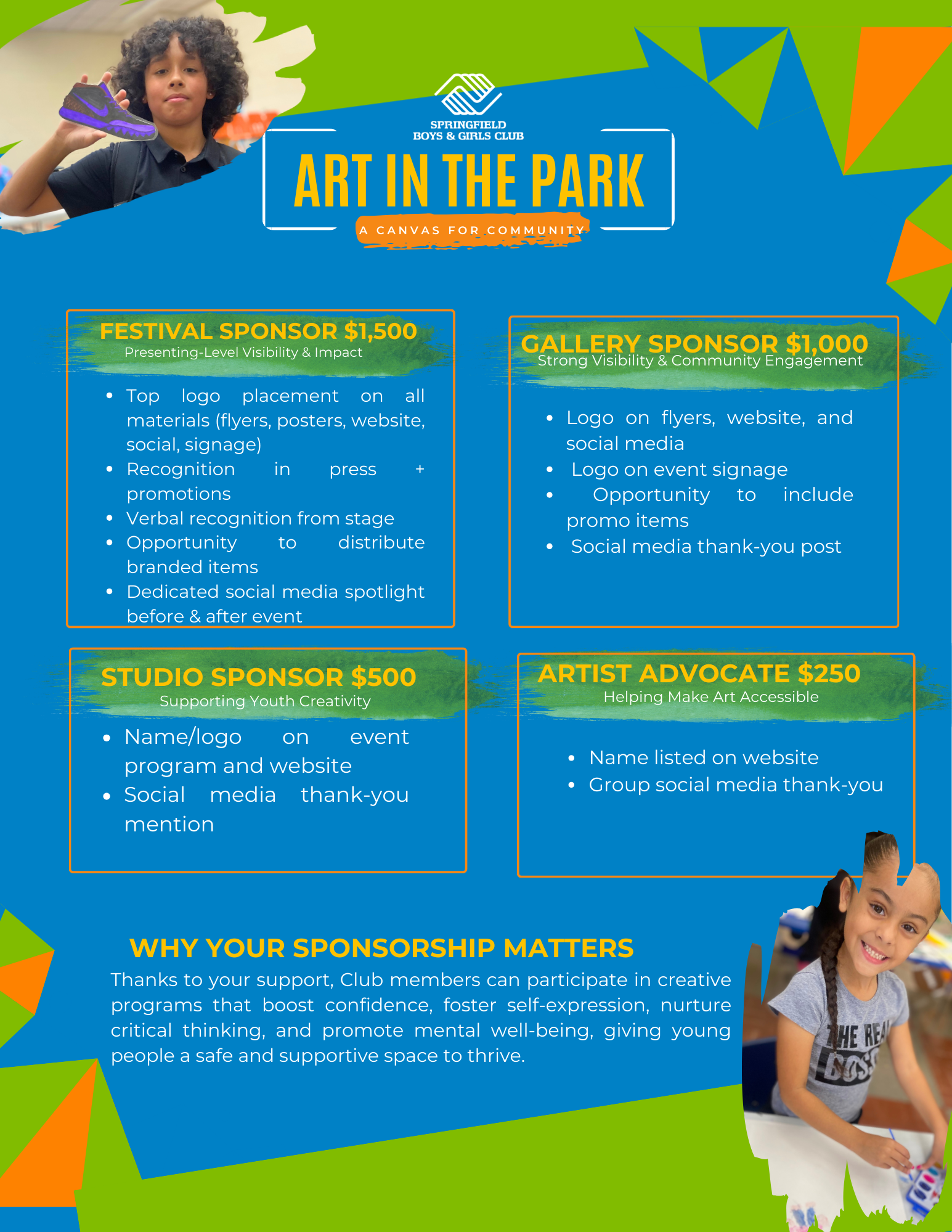 Art in the Park puts young people in the spotlight as creators and innovators. By showcasing youth artwork in a public space, we build confidence, celebrate expression, and remind young people their voices matter.